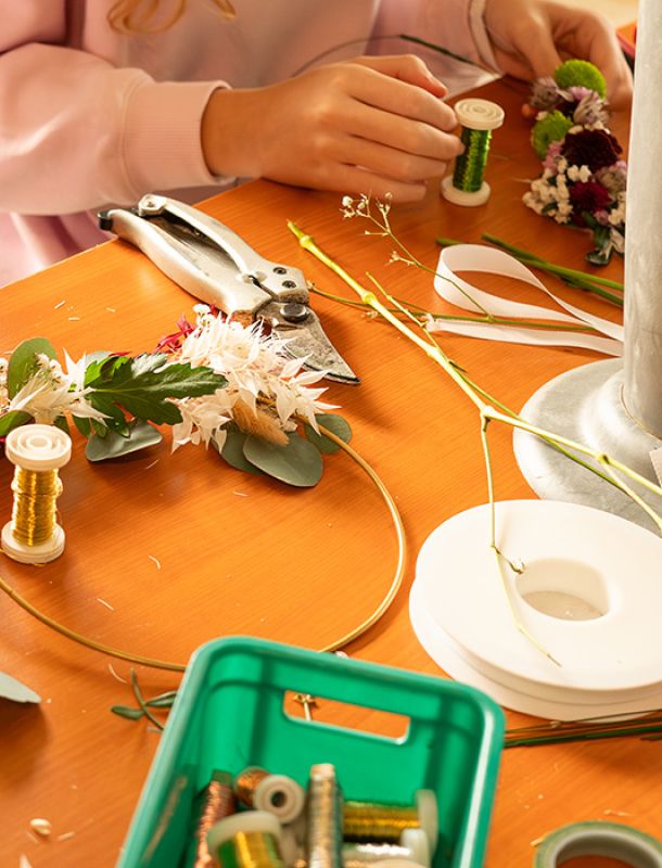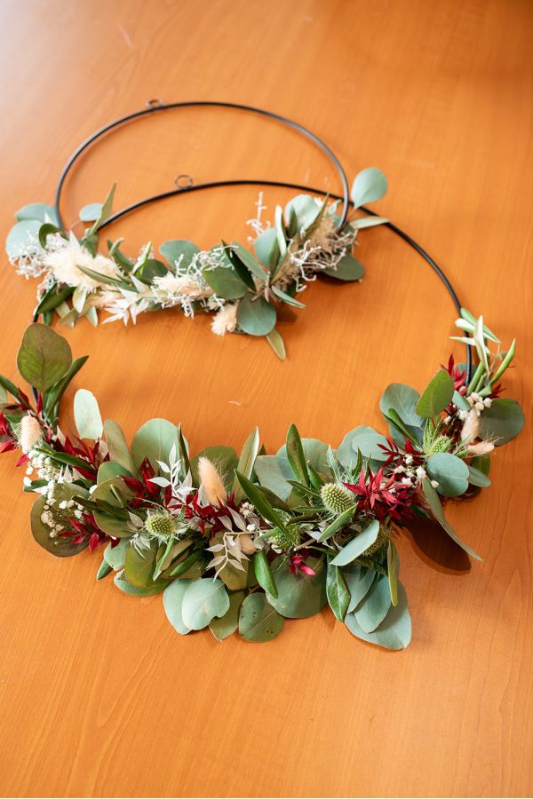 In diesem Workshop gestaltest du deinen eigenen Trockenblumen-Hoop – ein filigraner Metallring, liebevoll umwickelt mit edlen Trockenblumen, Pampasgras und zarten Blüten.